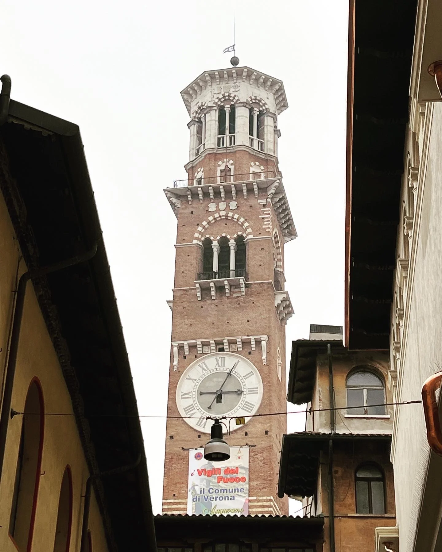 Next, we headed over to the Torre dei Lamberti, a medieval tower that rises above the city and offers one of the best views in Verona. Brandy and Brooke were troopers as we made our way up the steps (though we may have caught the lift partway up!). Reaching the top, we were rewarded with panoramic views of Verona’s red-tiled rooftops, winding streets, and, in the distance, the Adige River looping through the city.