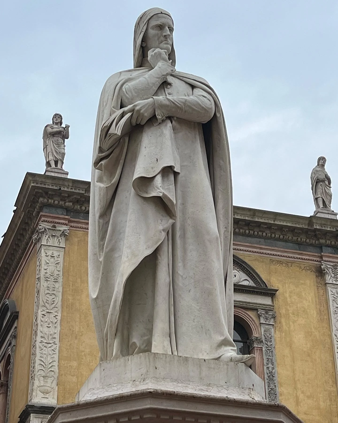 As we strolled through Piazza Bra, I spotted a statue of Dante Alighieri, an unexpected surprise and a real highlight for me. Standing there, looking up at the legendary poet, I felt a deep connection to Italy’s rich literary history. Dante’s influence echoes through centuries, and seeing his statue in Verona—a city he knew well during his exile—was powerful. For a few moments, I stood in awe, thinking about how his words, especially in The Divine Comedy, have shaped literature and our understanding of the human spirit.